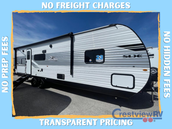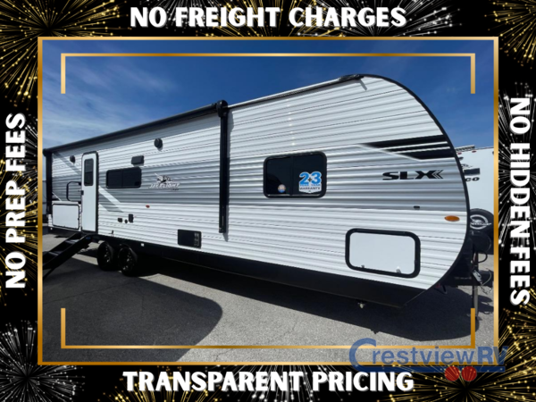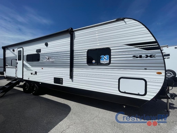 The Jayco Jay Flight SLX travel trailer is quite easy to own because it is lightweight for an easier towing experience. Built on a fully integrated A-frame with galvanized-steel, impact-resistant wheel wells, the Jay Flight SLX has quality at its very foundation. That quality continues on to the electric self-adjusting brakes, easy-lube hubs, Magnum Truss roof system, and LP quick connect. Some of what the mandatory Customer Value Package includes is backup camera prep, Keyed-Alike entry and baggage doors, and an on-demand tankless water heater.