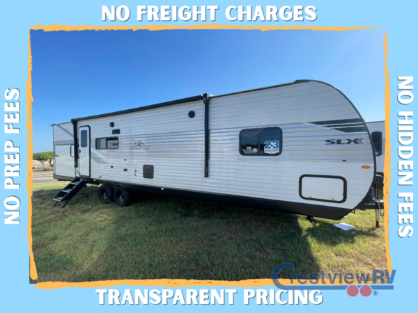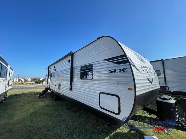 The Jayco Jay Flight SLX travel trailer is quite easy to own because it is lightweight for an easier towing experience. Built on a fully integrated A-frame with galvanized-steel, impact-resistant wheel wells, the Jay Flight SLX has quality at its very foundation. That quality continues on to the electric self-adjusting brakes, easy-lube hubs, Magnum Truss roof system, and LP quick connect. Some of what the mandatory Customer Value Package includes is backup camera prep, Keyed-Alike entry and baggage doors, and an on-demand tankless water heater