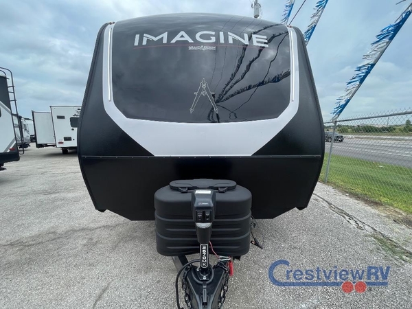 With this Imagine travel trailer, you can work while you're on the road because it offers you a desk in the main living area. You won't have to miss out on the action since you'll be right next to the booth dinette and tri-fold sofa, and there is even a pantry directly to the left of the desk for you to grab a quick snack while you're working. Once you're done with work, you can relax on the tri-fold sofa while you watch the telescoping LED HDTV, and the private bedroom offers you a 60" x 80" queen bed to rest on when you're ready to call it a night.