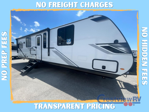 Experience the ultimate in RV living with our luxurious travel trailer, featuring a spacious rear kitchen perfect for meal prep. The pantry and fridge provide ample grocery storage, and the overhead cabinets add extra space for cookware and dishes. Plus, the microwave makes cooking and reheating meals a breeze, and the dinette is a great spot to enjoy meals or play games with family and friends. In the nice living room, you will find a trifold sofa, a perfect place to relax and unwind, and an entertainment center with a fireplace adding warmth and ambiance to the space. The full bathroom is beautifully appointed and provides all the essentials for a comfortable stay. Furthermore, the front bedroom is a serene retreat, featuring a spacious queen bed, dresser, wardrobe, and nightstands beside the bed for ultimate convenience. This travel trailer also features washer and dryer prep, making it easy to hook up to laundry facilities on the go, and with an outside kitchen, you can cook up a storm while enjoying the fresh air and scenery.