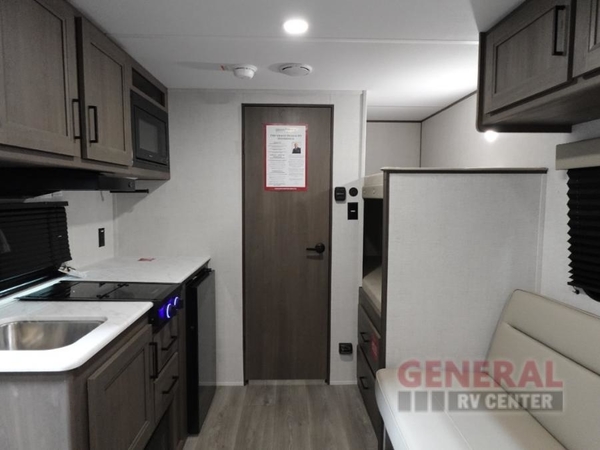 Camping trips to the lake have never been easier than with this travel trailer! The 28" x 67" bunks are right next to the private bath for easy nighttime use, and the front queen bed includes hidden storage for your things. There is also a 66" Jack knife sofa that provides a little more sleeping space for guests. A full kitchen lets you cook meals each day and there is an exterior LP quick connect if you want to fire up your own propane grill.