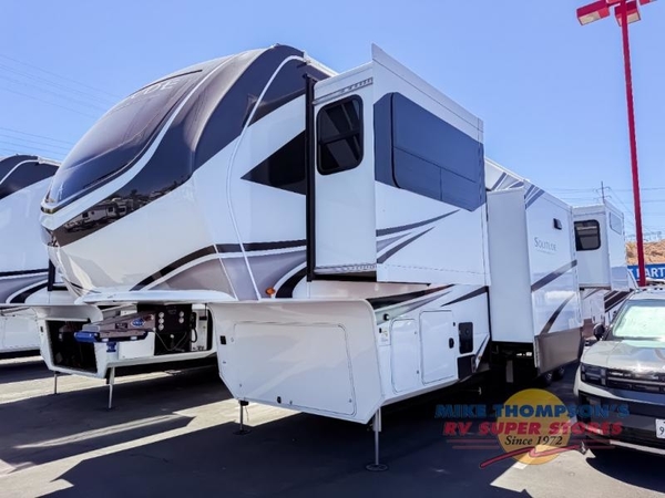 Each Solitude fifth wheel by Grand Design features a 101" wide-body construction, heavy duty 8,000 lb. axles, frameless tinted windows, and high-gloss gel coat sidewalls. You can camp year around thanks to the Weather-Tek Package that includes a 35K BTU high-capacity furnace, an all-in-one enclosed and heated utility center, and a fully enclosed underbelly with heated tanks and storage. Inside, you'll love the premium roller shades, hardwood cabinet doors, solid surface countertops, plus residential finishes throughout to make you truly feel at home. Each model also includes a MORryde CRE3000 suspension system, self adjusting brakes, and a MORryde pin box that will provide smooth towing from home to campground. Affordable luxury is possible with the Solitude fifth wheels; choose yours today!