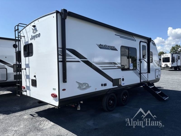 With any Jay Feather travel trailer by Jayco, you will enjoy lightweight towing, convenient exterior amenities, and at-home comforts inside! The Overlander 1 Solar Package included within the Jay Sport Package comes with a 200W solar panel and a 30-amp digital controller so you can enjoy some off-grid camping. There is also a modern graphics package with a dual-colored sidewall, LCI Solid Step fold-down aluminum tread steps on the main entry door, and Climate Shield 0 -100° F tested weather insulation package that will allow you to camp in all sorts of climates. The Customer Value Package will make time outdoors easier than ever with a power tongue jack and a Rock Solid stabilizer system, plus American-made nitro-filled Goodyear tires with self-adjusting electric brakes. More exterior features include a Keyed-Alike locking system, marine grade exterior speakers, a Magnum Truss roof system, and the list goes on! And we haven't even touched on the interior comforts, like the residential style seamless countertops and vinyl flooring throughout, decorative backsplash, handcrafted hardwood door/drawer fronts, and multiple USB charging ports to keep you going!