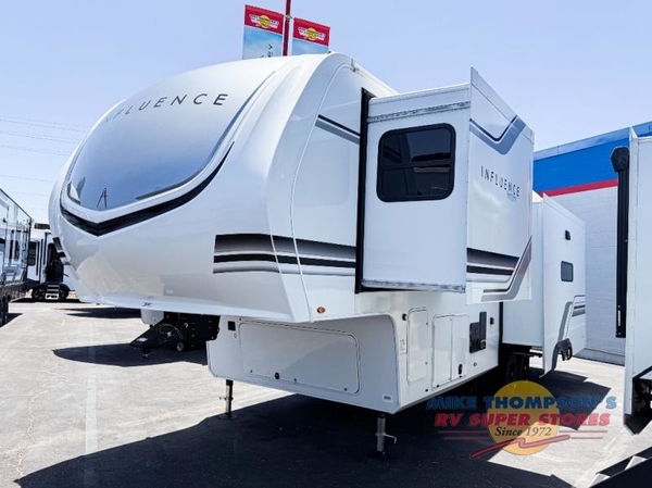 Any Grand Design Influence fifth wheel features five-sided aluminum cage construction with a walk-on roof and a fully enclosed underbelly with heated tanks and storage for all weather camping. For peace of mind, the MORryde CRE3000 Suspension system will provide safe and smooth towing, and the 101" widebody construction offers all the room you need and that is before multiple slides are fully engaged. You will appreciate the Keyed-Alike locks, slam-latch baggage doors with magnetic door catches, exterior security light, and SolidStep entry steps. On the inside, Congoleum flooring, premium roller shades for privacy, a hallway handrail for safety, and nightstands with USB ports to keep all of your electronics fully charged. You will also love the On Demand tankless water heater when showering, plus the added heat and ambiance from an electric fireplace, and so much more!
