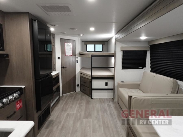 Get ready to take your travels to new heights with our incredible luxury travel trailer! The front bedroom has a queen bed, wardrobe, and overhead cabinets for all your favorite belongings, the perfect place to relax and recharge after a long day of adventure. The living room/kitchen combined area is equipped with a U-shaped dinette, three-burner cooktop, microwave, refrigerator, pantry, and 62 theater seating. Perfect for cooking up your favorite meals, entertaining friends and family, or simply relaxing and enjoying the comforts of home. The full bathroom is spacious and complete with a linen closet for added convenience. And with double-sized bunk beds featuring curtains and under-bunk storage, the kids will have their cozy retreat. But the adventure doesn't stop there! Outside, you'll find an exterior griddle with a 1.7 refrigerator, perfect for cooking up a storm in the great outdoors. And with a massive 19 awning, you'll have plenty of shade and protection from the elements, plus, with two entry/exit doors and pass-through storage, you'll have easy access to the trailer and all your gear.