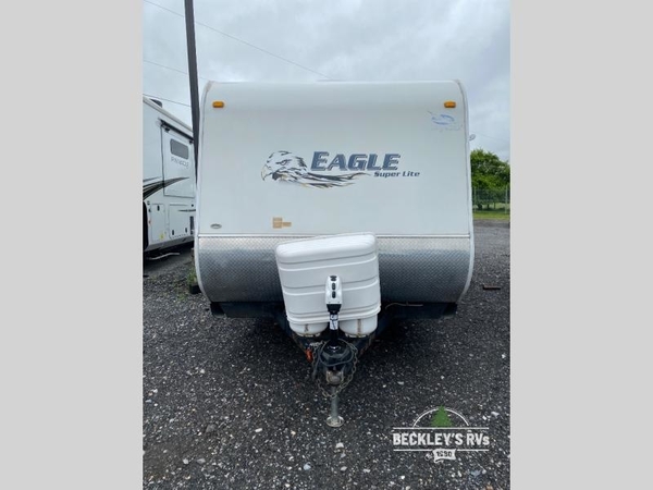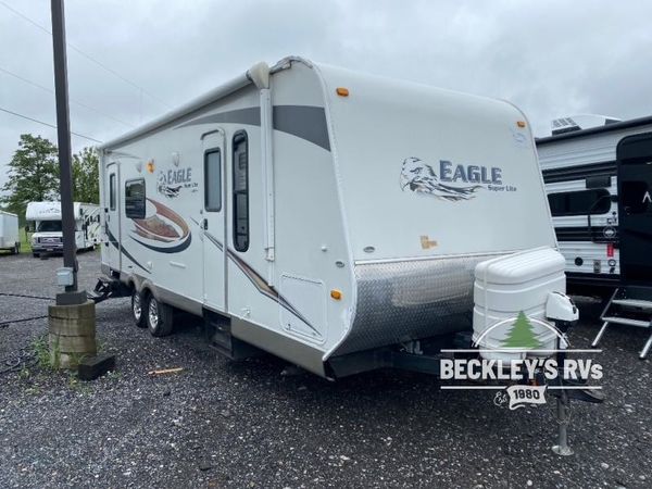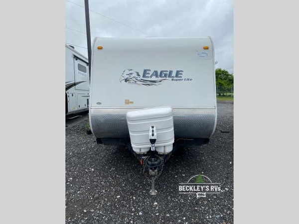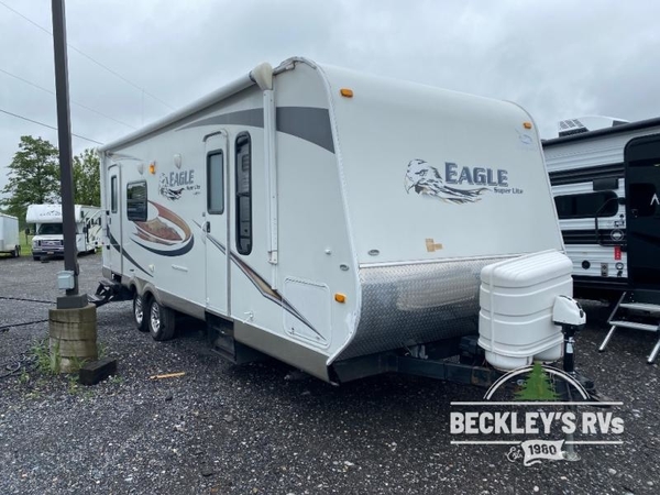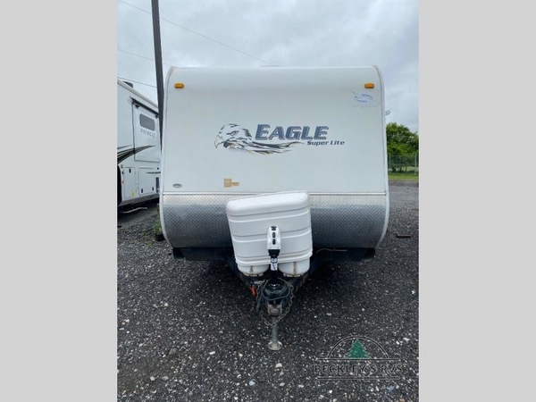 Single Slide Eagle Super Lite Travel Trailer by Jayco, Rear Kitchen w/Pantry, 3 Burner Range w/Micro., Dbl. Kit. Sink, Refrig./J-Steel Sofa/Wardrobe Slideout, Booth Dinette, TV Overhead Cabinet, Toilet, Lav. w/Med. Cab., Tub/Shower, Front Queen Bed w/Dbl. Wardrobes, Overhead Cabinets Throughout, 20' Awning & Much More. Available Options May Include: Hide-A-Bed.