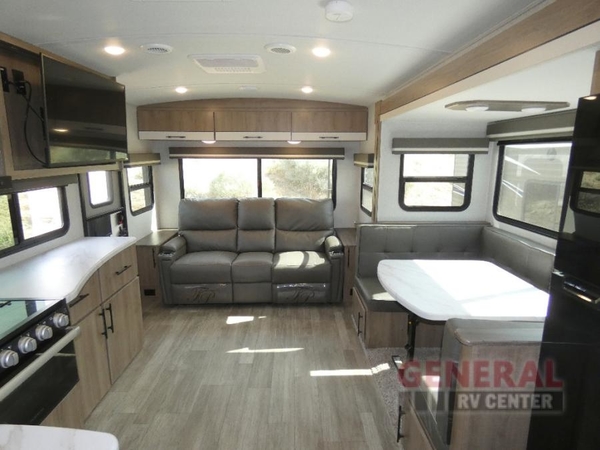 Just imagine leaving the world behind and secluding yourself away with your favorite people in your Grand Design Imagine travel trailer! The Imagine has been designed to enjoy extended season camping and includes a high-capacity furnace, a heated and enclosed underbelly with suspended tanks, a designated heat duct to the subfloor, and a high-density roof insulation with attic vent. You'll have maximum head room on the interior with 81" radius ceilings, and large panoramic windows to let in natural lighting. The exclusive drop-frame pass-through storage compartment is going to allow you to bring along lots of equipment, and the universal docking station is an all-in-one location for utilities and hook-ups. You'll also have industry-leading tank capacities so that you can fill and empty your tanks less often.