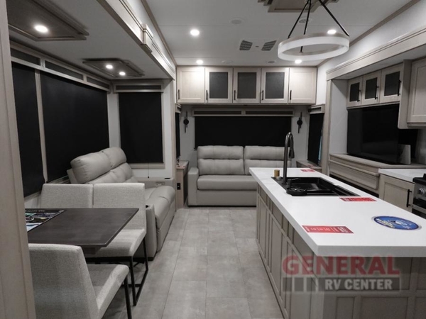 Are you looking to upgrade from a travel trailer to a fifth wheel? If so, this model will be perfect for you! Once you arrive at the campground, you can unload your gear from the pass-through storage, put out the two power awnings, then relax with a cold drink. Inside, you can kick your feet up on the theater seating, play a game at the free-standing dinette, or relax on the tri-fold sofa. The chef of your group will have a kitchen island with a Smart sink, dishwasher prep if you want the option to make cleaning up easier, plus a spacious 20 cu. ft. 12V refrigerator. There is also a built-in oven, plus a pantry and a hutch for storage galore! Having two bath sinks in the full bath is sure to be a big convenience when getting ready for bed, and the king bed slide out in the front bedroom will provide a great night's rest. You will also find a front wardrobe, a slide top dresser, plus washer/dryer prep!