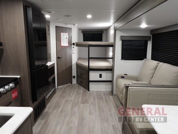 Get ready to take your travels to new heights with our incredible luxury travel trailer! The front bedroom has a queen bed, wardrobe, and overhead cabinets for all your favorite belongings, the perfect place to relax and recharge after a long day of adventure. The living room/kitchen combined area is equipped with a U-shaped dinette, three-burner cooktop, microwave, refrigerator, pantry, and 62 theater seating. Perfect for cooking up your favorite meals, entertaining friends and family, or simply relaxing and enjoying the comforts of home. The full bathroom is spacious and complete with a linen closet for added convenience. And with double-sized bunk beds featuring curtains and under-bunk storage, the kids will have their cozy retreat. But the adventure doesn't stop there! Outside, you'll find an exterior griddle with a 1.7 refrigerator, perfect for cooking up a storm in the great outdoors. And with a massive 19 awning, you'll have plenty of shade and protection from the elements, plus, with two entry/exit doors and pass-through storage, you'll have easy access to the trailer and all your gear.