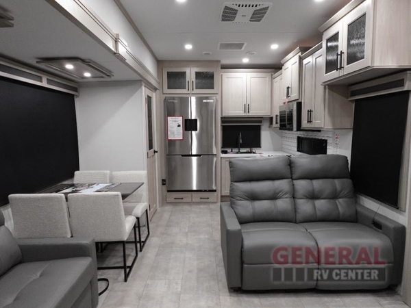 Comfort will come easy in this four slide out fifth wheel! You will feel right at home with a master bedroom that includes a bed slide out, dual dressers with a seat in between, plus a large front bath with tons of space. The convenient half bath is right as you enter the unit for convenience. Your crew can get cozy on the dual tri-fold sofas within dual opposing slides, or on the theater seating across from the LED TV and fireplace. One feature you will love about this fifth wheel is the rear kitchen with wrap-around counter space, a built-in oven, plus a 20 cu. ft. 12V refrigerator and a large pantry to keep food fresh.