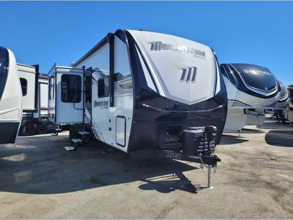 Are you looking for adventure and fun? The Momentum G-Class toy hauler by Grand Design will help you find it! You can explore during any season you choose with the Insulation Package that includes a heated and enclosed underbelly with suspended tanks, a high-capacity furnace, a moisture barrier floor enclosure, and cabinet-mounted heat ducts. Each model includes a fuel station with an interior and exterior gauge, a dovetail rear rend, and 2,500-LB tie-downs anchored into the chassis. Throughout the Momentum G-Class interior, you'll enjoy many comfortable features like large panoramic windows, a shower skylight, USB chargers in the bedroom, and residential cabinetry.