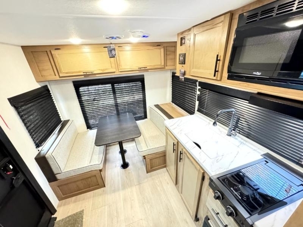 The slide-out creates more interior room, giving you space to relax, dine, or work remotely. The dinette also converts into an additional sleeping area for guests or pets.