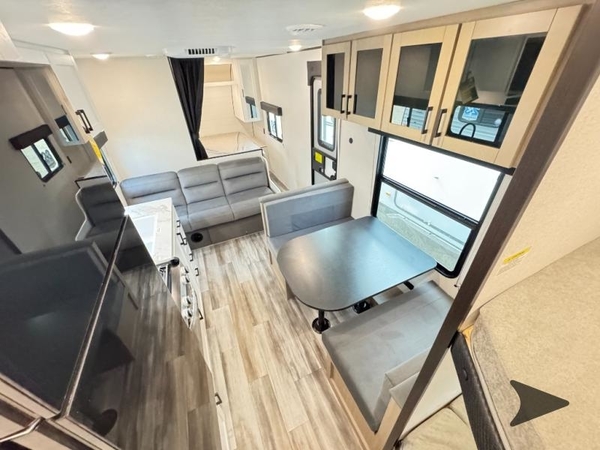 You can comfortably sleep eight to ten people in this trailer thanks to the double-size bunks, the RV queen bed in the front bedroom, plus the booth dinette and jack-knife sofa in the main living area! The chef of your crew will have a three burner cooktop and microwave oven to prepare meals, and everyone can store their favorite drinks in the 8 cu. ft. 12V refrigerator. The bathroom includes a tub/shower and a toilet, with the sink just outside of this room so others can brush their teeth if one is taking a shower before bed. The outside storage will let you bring along fishing poles and the 16' power awning with LED lights will create a nice place to gather in the evenings!