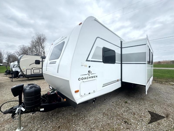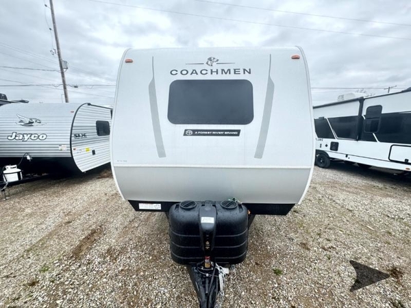 With any Freedom Express Select travel trailer by Coachmen you will find an alumicage construction and vacuum bonded walls with Azdel composite for a trailer made to last. These Select value models come standard with a Bluetooth interior speaker, night shades, and wear-resistant vinyl flooring throughout. You will appreciate the power tongue jack, as well as the Tufflex PVC roof and heated and enclosed underbelly to extend your camping season. A 15K BTU roof A/C will keep you comfortable, and the tankless water heater will provide endless hot showers!
