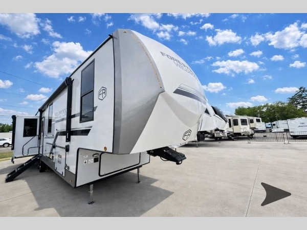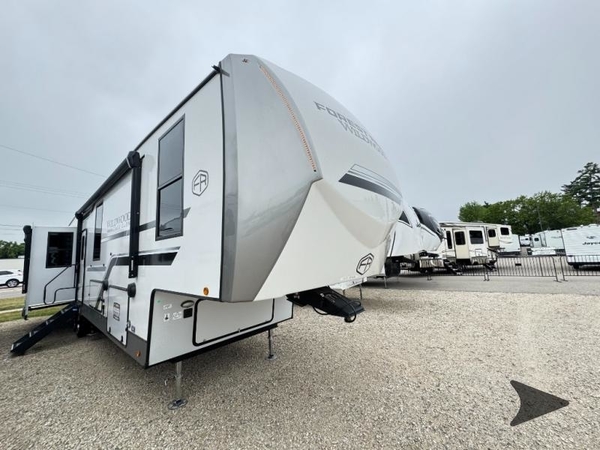 With any Wildwood Heritage Glen fifth wheel by Forest River, the quality construction, attention to detail and design along with a bright and welcoming interior allows you to relax in comfort with conveniences while exploring outdoors. The Summer Wind colored horizontal plank linoleum flooring is unique, beautiful and durable, and there are gold-accented faucets with stainless steel sinks in the bathrooms for added luxury. The Accessibelly underbelly with 12V tank heaters will help protect your unit from the elements, and the power stabilizer jacks and landing gear will make set-up a breeze. More features that provide convenience include the high-end solid surface countertops, an RV Airflow System that provides at least 25% better airflow, and solar prep for off-grid capabilities.