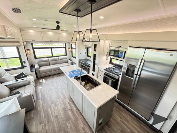 You can work from anywhere with this fifth wheel thanks to the middle bonus room that offers a desk with TV above, a tri-fold sofa with removable table, a flip-up bunk and a closet. This multi-use room works for just about anything including an extra living area and bunkhouse. The shoe storage under the interior steps, the linen cabinet in the full bathroom, the walk-in closet in the bedroom, and the overhead cabinets plus exterior storage allows you to bring whatever you want. Enjoy cooking in the kitchen that provides an island with a flip-up butcher block, a residential refrigerator, a pantry, and everything you need to keep everyone fed. The theater seats, the tri-fold sofa and the free standing table without a pedestal are great places to sit while watching the 50" Smart LED HDTV with fully digital HDMI output and home entertainment system with subwoofer, plus there is a fireplace below for those chilly evenings.