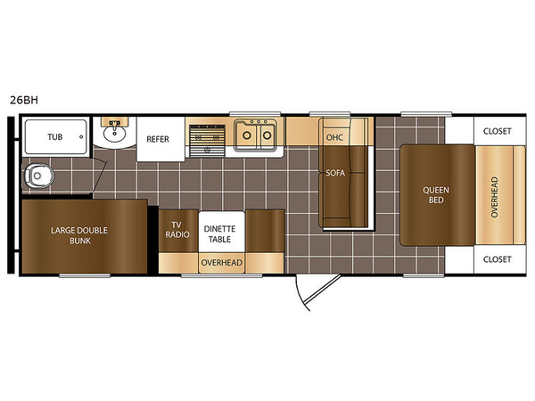 The kitchen and living area offer a sofa, double kitchen sink, three burner range, and refrigerator. The dinette is on the opposite side. You will find a spot for a TV/Radio above the dinette.