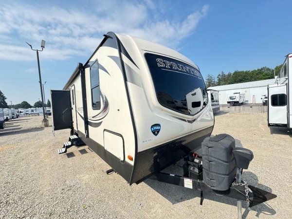 With any Sprinter travel trailer or fifth wheel you can expect "Camping Made Easy!" With the Limited Advantages found on today's models, you will have peace of mind knowing that your unit is quality built and has been triple and quadruple checked before it even leaves the plant. And, once it does, you will still retain a 3-year Industry-Leading limited structural warranty. With the KeyShield paint protection, you can expect your front cap to be looking like new for years to come with up to seven layers of paint protection covering it. You will also appreciate the remote that allows you to easily control your slide rooms, awning, lights, and enjoy push-button leveling! Yes, you heard that right, auto leveling no longer has you crawling around on your hands and knees sliding around boards to level. If all that technology isn't enough, know that your Sprinter is fully prepped for as much technology that you wish. You will find solar prep, backup camera prep, Wi-Fi prep, and so much more! Come make your selection today!