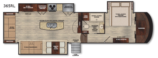 Are you ready to relax? Well come make this Vilano 365RL your home away from home. You will enjoy all of the comforts throughout from the comfortable seating at the 80" sofa bed to the 70" theater seats. In the evening plan to watch TV at the LED TV within the roadside slide out, plus there is a fireplace where you can enjoy the warmth on a cool evening. At night come retreat to the spacious master bedroom where you will find a king bed, a large wardrobe, plus a 40" dresser, and so much more!