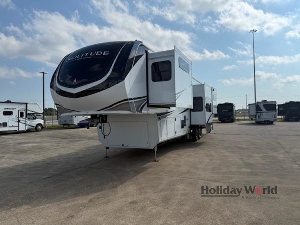 Each Solitude fifth wheel by Grand Design features a 101" wide-body construction, heavy duty 8,000 lb. axles, frameless tinted windows, and high-gloss gel coat sidewalls. You can camp year around thanks to the Weather-Tek Package that includes a 35K BTU high-capacity furnace, an all-in-one enclosed and heated utility center, and a fully enclosed underbelly with heated tanks and storage. Inside, you'll love the premium roller shades, hardwood cabinet doors, solid surface countertops, plus residential finishes throughout to make you truly feel at home. Each model also includes a MORryde CRE3000 suspension system, self adjusting brakes, and a MORryde pin box that will provide smooth towing from home to campground. Affordable luxury is possible with the Solitude fifth wheels; choose yours today!