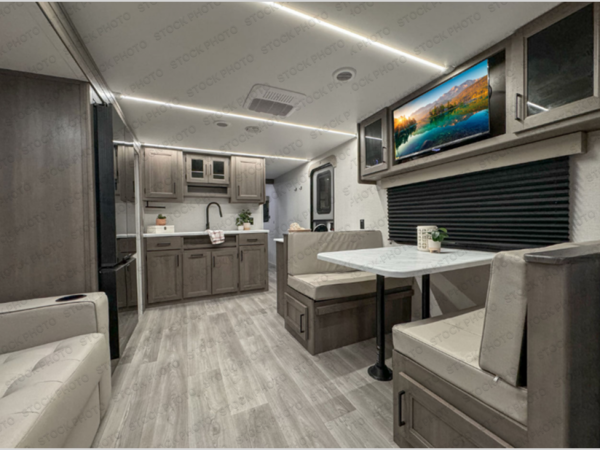 You're going to love every minute spent in this Transcend travel trailer! Your guests or the little ones will have the rear bunkhouse all to themselves that includes a residential full-size bed and two bunks, storage drawers, and TV prep if you want to add a television here. You'll enjoy your own space up front in the private bedroom with a queen bed, storage drawers, and TV prep here also. The combined kitchen and living area includes a sleeper sofa with an optional theater seating, a booth dinette where you can dine together, and a 32" TV for movie nights! The exterior is just as accommodating with its 20' awning, rear storage, plus exterior griddle and refrigerator!