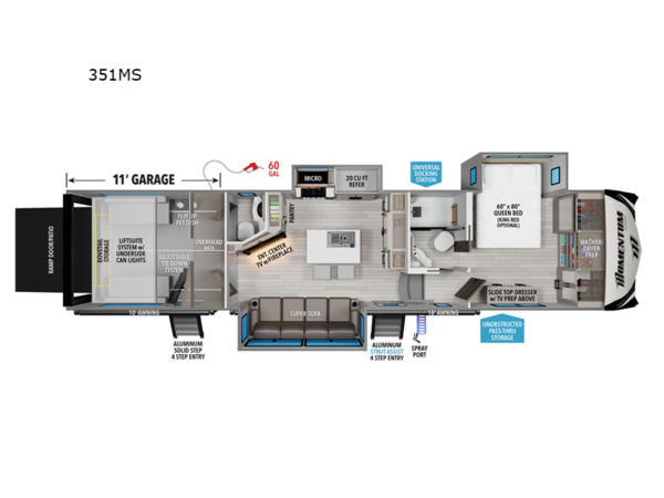 Traveling with friends and family can be comfortable when you have a full double entry bathroom and a half bath available when camping and enjoying the trails on your off-road toys! You will have an 11' garage space that can become a second living/dining area, and you can add the optional Liftsuite System for more sleeping space. An overhead bed comes standard, along with a super sofa in the main living area where guests can sleep. Everyone can watch the LED TV when waiting for dinner, and enjoy the fireplace on those chiller nights. The kitchen island offers a sink to wash dishes, extra counter space for serving meals and two stools to dine at. The cook will love all the upgraded appliances, and the space thanks to the slide. The front bedroom gives you a queen bed slide with a king bed option, lots of clothing space, and a slide top dresser for even more storage.