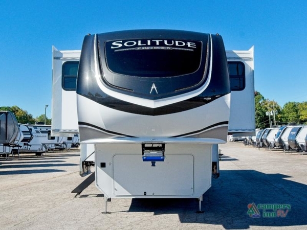 Experience residential-style comfort and spacious living with the Grand Design Solitude 380FL, a luxury fifth wheel designed for extended stays and full-time RV living. With five slide-outs, this model offers expansive interior space, including a private front living area perfect for entertaining or relaxing.