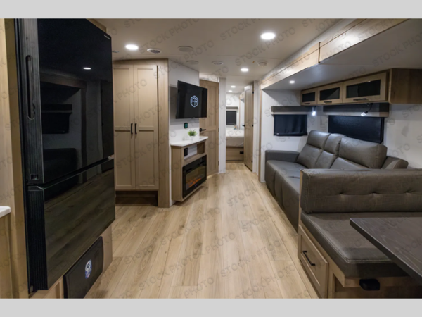 When you are outside this trailer you can enjoy the protection from the 21' power awning, you will falso find exterior storage for your extra gear, and a ladder at the rear. You get to choose which entrance to step up into, be it the spacious rear bedroom with a queen bed slide and a wardrobe, or the main entry into the kitchen and living area. The furniture slide includes a booth dinette to eat your meals at, and theater seating to watch the Smart TV with a fireplace below. And the cook will love the front kitchen with extra counter space, a three-burner range, plus a 12V refrigerator and pantry for food storage!