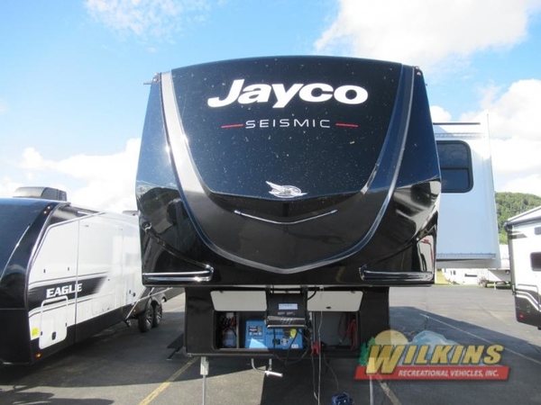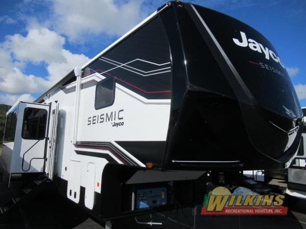 One look at the Seismic toy haulers by Jayco, and you'll never go back! Each model features a custom automotive-grade vinyl exterior graphics package, a painted fiberglass front cap with built-in LED lighting, and 102" wide-body structural steel I-beam construction. You'll find the pass-through storage with Slam-Latch baggage doors will make unpacking easier than ever, and the rear ramp door/patio with anti-slip, non-skid flooring will allow you to unload your toys with no trouble at all. These toy haulers feature a three seasons garage wall/doors, a 30 gallon fuel tank with a timer, and exterior marine-grade speakers to keep the party going. The Climate Shield zero degree tested weather protection includes a 35,000 BTU furnace, PEX plumbing, and a fully enclosed and heated underbelly so you can enjoy your adventures year around. And we haven't even touched on the interior luxuries you'll find, like solid hardwood cabinet doors, residential vinyl flooring made in the USA, night shades, and more!