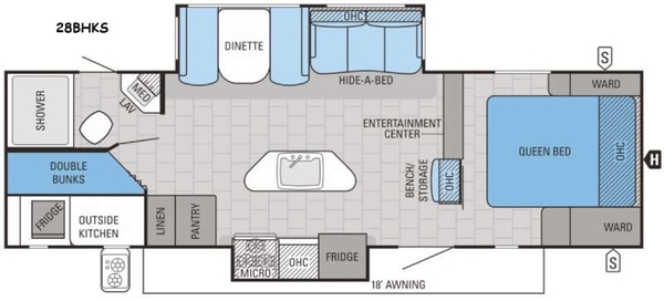 As you enter the front main entrance, there is a bench seat with storage and overhead cabinet. You will enjoy watching TV or movies on the entertainment center which is next to the bench and road side slide.