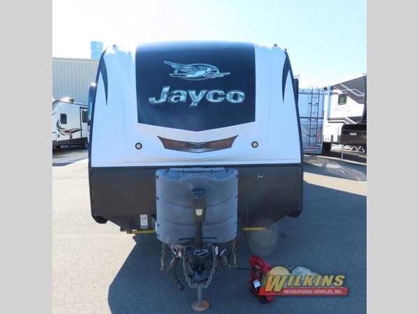 The White Hawk 28BHKS travel trailer by Jayco provides sleeping space for up to eight people as well as an exterior kitchen, two entrances, and a kitchen island.