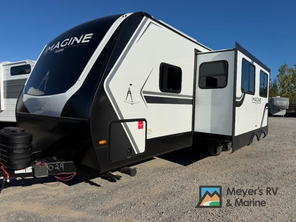 Where will you go with this Imagine travel trailer? The possibilities are endless! You can take your family on an exciting excursion because this trailer has enough sleeping space for everyone with a 60" x 80" queen bed in the private bedroom, a U-shaped dinette and tri-fold sofa in the main living area, and there is a set of 47" x 76" bunk beds with privacy curtains in the rear corner. You can come and go as you please with two entry doors, and the outdoor griddle and refrigerator will be fun to use when the weather is nice. The flip-up countertop extension will make it easier to prepare delicious home cooked meals and the shoe storage area helps to keep things neat and tidy.