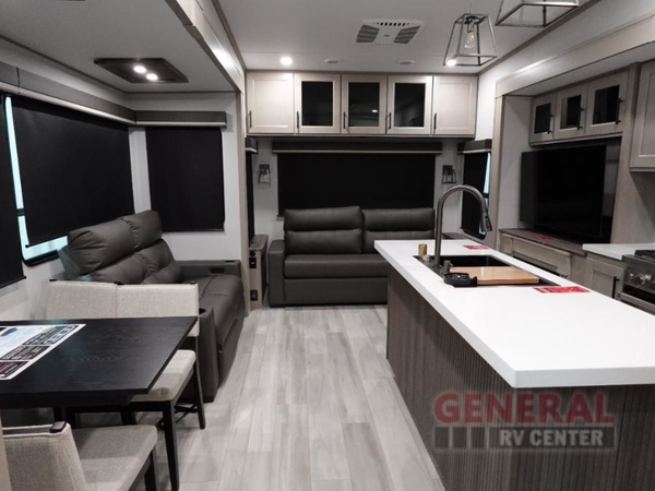 You'll feel right at home in this spacious fifth wheel with triple slides, a front master bedroom, and a kitchen island with extra counter space. The theatre seating is right across from the entertainment center which includes a 40" TV and fireplace, and there is a rear tri-fold sofa if you have any guests staying over. This model includes a hutch in the kitchen with cabinets above to store you nice dishes, plus there is a large pantry with washer and dryer prep if you plan to go full-time. Head to the dual entry bath that includes a linen closet and a spacious shower, and check out the front master bedroom with its queen bed, and slide out wardrobe.