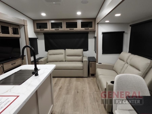 You'll love the amount of space you have in this fifth wheel thanks to the dual opposing slides in the rear living area/kitchen. Your friends and family can relax on the tri-fold sofa or theater seating across from the high-definition 40" LED TV. The chef of your group will appreciate having a kitchen island that will provide more counter space, plus there is a hutch with overhead cabinets for nice dishes. A full bath onboard lets you clean up each day and the front private bedroom includes a queen bed just like at home. You'll also love spending time outdoors under the electric awning, and there is an unobstructed pass-thru storage for fishing poles, hiking gear, and camp chairs!