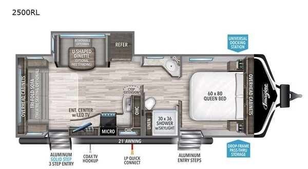 With any Imagine by Grand Design the construction includes a laminated aluminum framed main floor, rear wall, side walls, roof and end walls in the slide rooms and floors, plus a one-piece roof membrane giving you years of lightweight towing to your favorite destinations. Best in class storage is found in the exclusive drop frame unobstructed pass through storage, and the Universal Docking station offers an all-in-one location for utilities and hookups, plus you will find industry leading tank capacities and extended season camping with the mandatory four-season protection package. Inside you will experience residential cabinetry and a pull-down sprayer kitchen faucet, upgraded residential furniture and countertops, plus much more with an 81" radius ceiling for a spacious interior. Choose your favorite Imagine today, and start adventuring in a lightweight and comfortable trailer!