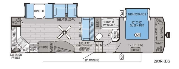 When you are ready to start you next vacation, choose the rear kitchen Jayco Eagle 293RKDS fifth wheel featuring walk-in bedroom closet and kitchen pantry.