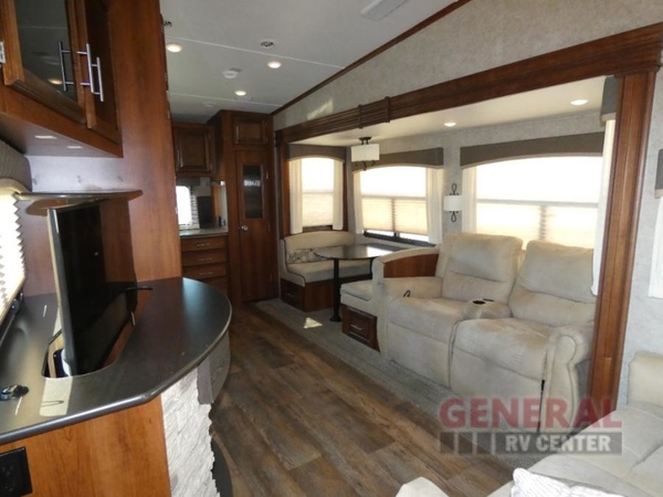 As you enter the fifth wheel, there is a hide-a-bed sofa directly in front of you. Above the sofa there is an overhead cabinet. Adjacent to the sofa you will find a slide with a theater sofa and a booth dinette providing plenty of seating for the whole family plus some. Across from the theater seating you will enjoy a pop up TV entertainment center with a fireplace for those cooler nights. Don't forget about the ceiling fan that will help keep you cool in the summer time.