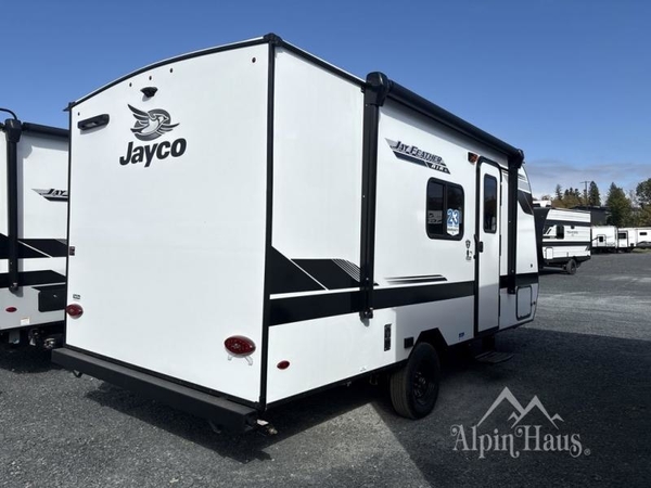 The Jay Feather Air SL travel trailer by Jayco is affordable, convenient, and lightweight for an easier tow! A Magnum Truss roof system and fully integrated A-frame provide a strong foundation to the trailer, plus there are galvanized-steel, impact resistant wheel wells for added protection. Some of the exterior conveniences you'll find include a front tongue jack and stabilizer jacks, roof mount solar prep, an exterior porch light, and G20 dark tinted privacy windows. Head inside to enjoy solid hardwood cabinet doors, residential-style kitchen countertops, a marine-grade toilet with foot flush, and vinyl flooring throughout that will be easy to keep clean. This super lite travel trailer is the perfect choice for rookie RVers and seasoned campers alike!
