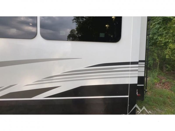 Entertainment can be found throughout this fifth wheel from the front living area with a 50" Smart LED HDTV with fully digital HDMI output and home entertainment system with subwoofer including a fireplace below that you can enjoy while relaxing on theater seats and two tri-fold sofas, a 32" TV in the middle kitchen and there is a bedroom 32" TV. You might even like to add the tailgate TV option along the exterior. Back inside the kitchen, the cook will love the center island, the pantry, the residential refrigerator, and the roll-top dinette. The half bath is a few steps away as an added convenience. The master bedroom includes a king bed slide, a bench, two wardrobes and a sliding door into the bathroom which offers two sinks, a space prepped for a washer/dryer option, and a walk-in shower. And don't forget about the exterior features such as the outside kitchen for more choices when making meals, the storage for your outdoor gear and chairs, and two awnings with integrated LED lighting.