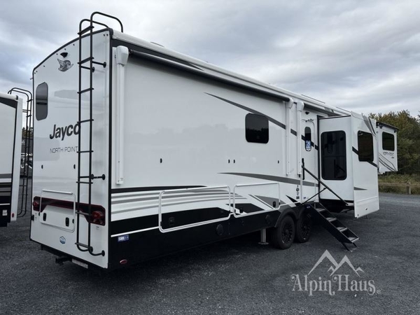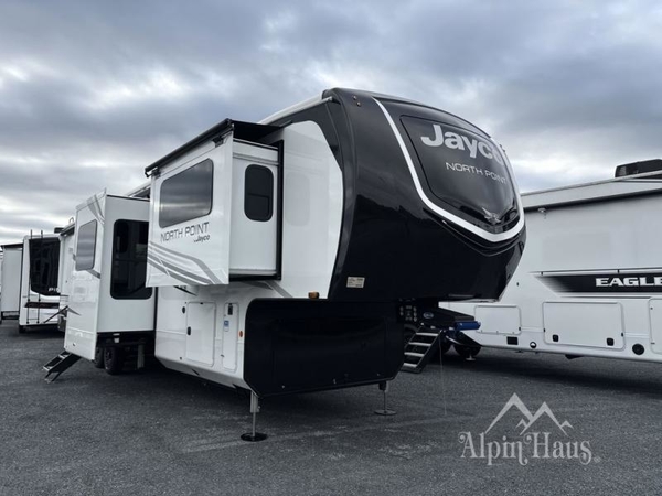 With any North Point fifth wheel by Jayco you begin with a strong foundation with a custom frame, designed and sized specifically to best support each unit. Constructed with Stronghold VBL aluminum framed, vacuum bond laminated walls and the Magnum Truss XL6 roof system with an Alpha roof membrane system, which is the strongest tested roof in the industry. The 5-Star Handling package is included with Uniroyal tires, a MORryde rubber pin box, Dexter axles with Nev-R-Adjust brakes, MORryde CRE-3000 rubberized suspension and wet bolt fasteners and bronze bushings. The interior has handcrafted hardwood glazed doors and drawers, vinyl flooring throughout, an integrated under-mount sink in the main bathroom, plus so much more you just have to see one to believe it all!