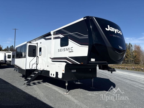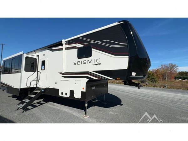 One look at the Seismic toy haulers by Jayco, and you'll never go back! Each model features a custom automotive-grade vinyl exterior graphics package, a painted fiberglass front cap with built-in LED lighting, and 102" wide-body structural steel I-beam construction. You'll find the pass-through storage with Slam-Latch baggage doors will make unpacking easier than ever, and the rear ramp door/patio with anti-slip, non-skid flooring will allow you to unload your toys with no trouble at all. These toy haulers feature a three seasons garage wall/doors, a 30 gallon fuel tank with a timer, and exterior marine-grade speakers to keep the party going. The Climate Shield zero degree tested weather protection includes a 35,000 BTU furnace, PEX plumbing, and a fully enclosed and heated underbelly so you can enjoy your adventures year around. And we haven't even touched on the interior luxuries you'll find, like solid hardwood cabinet doors, residential vinyl flooring made in the USA, night shades, and more!