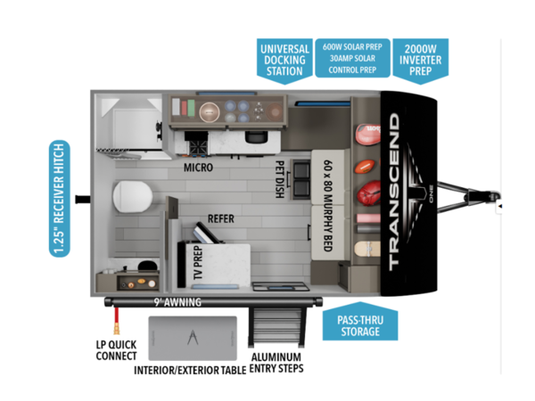 Travel in this 131DL model and tep inside through the sturdy aluminum entry steps and you'll be greeted by a versatile 60" x 80" Murphy bed that doubles as a comfortable seating area during the dayperfect for relaxing with your furry companion, thanks to the included pet dish. In the center, the kitchen offers all the essentials for preparing a delicious meal, featuring a microwave, 2-burner range, 3.3 cu. ft. refrigerator, and overhead cabinets for added storage. At the rear, enjoy the convenience of a full bathroom complete with a walk-in shower and foot-flush toilet, making life on the road both comfortable and functional.