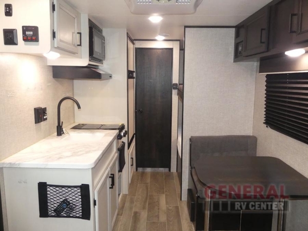 This Jay Flight SLX 7 travel trailer offers you a queen-size bed for sleeping at night, and there is even a privacy curtain that you can draw to separate the bed from the rest of the trailer too. The 29" x 75" bunk beds are another sleeping location, and you can even create a bed for one more person by transforming the booth dinette. Overhead cabinets will help you keep your belongings organized, and the kitchen has a two-burner range, 6-cubic foot refrigerator, residential-style countertops, microwave oven, and a high-rise faucet at the sink to help you prepare meals.
