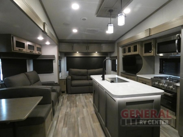 Travel to see new state parks, RV resorts or your family in other states as you tow this fifth wheel to each destination! You will enjoy comfort and convenience, plus a place to work, and be able to offer extra sleeping space for friends and family when they visit. The middle extra room provides a tri-fold sofa slide, a desk, a wardrobe, plus a 64" x 88" upper bed loft area with access from the hallway. The full bathroom will keep everyone refreshed, and the front bedroom allows you to sleep on a queen bed slide or choose the king option. And you will love the front wardrobe, the dresser, and the option to add a washer/dryer. And the kitchen island, appliances, and large pantry allow you to take everything you need with you.