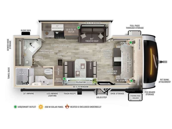 The industry-exclusive Super Suite bedroom in the Go Explore is a game-changer, featuring an under-bed storage system to keep all your belongings organized. The spacious pass-through storage compartment includes thoughtful additions like pegboards, a fishing rod holder, and more, making organizing effortless.