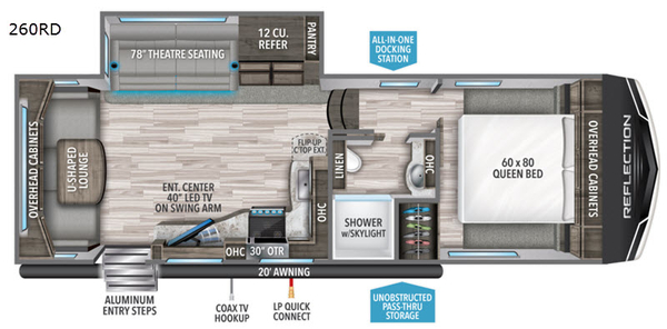 Load up lots of cold food in the 12 cu. ft. refrigerator to enjoy a weekend away from it all! The dry food can be placed in the pantry and overhead cabinets, depending where you want everything. You will enjoy having the appliances near by to make a warm meal in the L-shaped corner kitchen that is next to the entry in case you need to carry anything outside to eat under the 20' power awning. And you can grab your camp chairs from the exterior unobstructed pass-through storage. You might prefer to dine at the U-shaped dinette with a view, and watch TV from the theatre seating with massage feature. At night you can get cleaned up in the full bathroom with a walk-in shower, and fall quickly to sleep on your own queen bed.