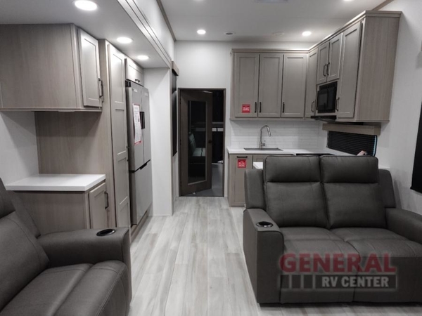 A 14' separate garage in this toy hauler offers plenty of space for your off-road toys! You will also appreciate the two entry doors, and flip-up pet dish. The rear ramp door can even be converted into a patio, plus there are exterior speakers to keep the party going. Everyone will love hanging out in the separate living area with a fireplace at the entertainment center, two theater seating slides, and a third theater seating. The fully equipped kitchen has everything you need to prepare delicious home cooked meals. The front private bedroom offers an escape to rest and relax on a bed for the next ride!