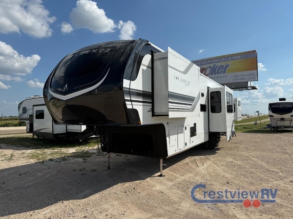 Any Grand Design Influence fifth wheel features five-sided aluminum cage construction with a walk-on roof and a fully enclosed underbelly with heated tanks and storage for all weather camping. For peace of mind, the MORryde CRE3000 Suspension system will provide safe and smooth towing, and the 101" widebody construction offers all the room you need and that is before multiple slides are fully engaged. You will appreciate the Keyed-Alike locks, slam-latch baggage doors with magnetic door catches, exterior security light, and SolidStep entry steps. On the inside, Congoleum flooring, premium roller shades for privacy, a hallway handrail for safety, and nightstands with USB ports to keep all of your electronics fully charged. You will also love the On Demand tankless water heater when showering, plus the added heat and ambiance from an electric fireplace, and so much more!