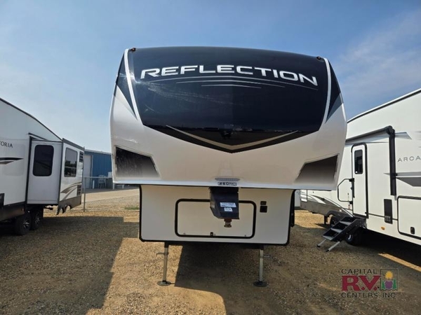 With any Reflection 150 Series fifth wheel by Grand Design, there is more available payload capacity and a broader range of half-ton trucks capable of towing this fifth wheel, and no slider hitch is needed thanks to the 90-degree turning radius which makes them short bed friendly and easier to tow. The mandatory Ultimate Power package provides a "One-Touch" automatic leveling system and a detachable power cord with LED light for easy setup, plus motion sensor pass-through lighting and entry lighting, and the Tire Linc TPMS will help you stay safe on the road. The interior offers residential luxury from the cabinetry and gunstock hardware plus the booth dinette to the residential-style window treatment. Make your refined decision today!