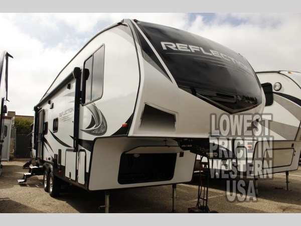 Load up lots of cold food in the 12-cu. ft. refrigerator to enjoy a weekend away from it all in this Reflection 150 Series fifth wheel! The dry food can be placed in the pantry and overhead cabinets, depending on where you want everything. You will enjoy having the appliances near by to make a warm meal in the L-shaped corner kitchen that is next to the entry. Head outside to sit under the 18' electric awning, and you can grab your camp chairs from the exterior unobstructed pass-through storage. You might prefer to dine at the U-shaped dinette with a view and watch TV from the theatre seating that has a massage feature. At night, you can get cleaned up in the 30" x 36" shower with skylight and fall quickly to sleep on your own queen bed.
